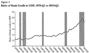 “Figure 4 … shows that bank credit relative to nominal GDP rose at the end of 2008 to an all-time high. And while this declined by the first quarter of 2010, bank credit was still at a higher level at this point than any time before 2008.6.