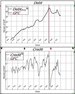 Credit: Source – Comparison of debt/GDP with credit/GDP over time. Note the profound difference between the two during the time of the GFC (2008-2009)
